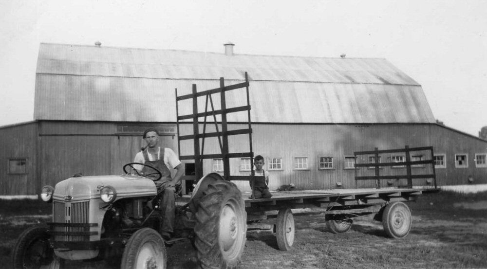 À gauche, Bernard Choquette, devant l'étable à Henryville |