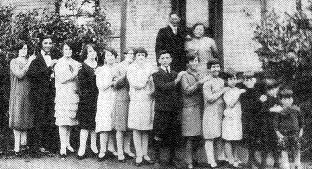 Joseph Choquette est né à La Patrie le 10 septembre 1876. Il épousa en mai 1903 Séraphine Prévost (on l'appelait Séraphie), fille de Napoléon Prévost et Célina Morel. Ils vinrent demeurer au village sur la terre que son père Joseph-Xavier avait commencé à défricher. Ils y demeurèrent toute leur vie. La ferme familiale passa tour à tour à ses fils Étienne et Eustache; elle appartient maintenant à son petit-fils Jacques Blais. Joseph Choquette participa activement à la vie paroissiale. Il fut secrétaire du Syndicat laitier (beurrerie et fromagerie), du Cercle agricole, gérant de la Caisse populaire, conseiller, maire, préfet de comté, président de la Commission scolaire, marguillier, facteur rural durant ses vingt dernières années. De son mariage naquirent quinze enfants (voir photo ci-dessous). Arthur et Henri, orphelins de son frère Fortunat, firent partie de la famille. Joseph Choquette épousa en secondes noces Cécile Bernard, de Bonaventure. Source : Livre du 125e anniversaire de La Patrie. |