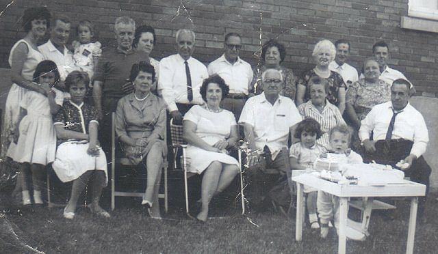 ![]() Quelques descendants de Mastaï Choquette et Ernestine Chevalier, juillet 1962 (chez Gilles Choquette, à Chambly) : À l’arrière, de gauche à droite : Thérèse Brault, son époux Jean Choquette (fils de Gaston, petit-fils de Mastaï) et leur fille Jeanne; Jacques (fils de Mastaï) et son épouse Thérèse Boulanger; Roger (fils de Mastaï), monsieur Paquette et son épouse Alice Gagné (sœur de Marie-Jeanne Gagné); Aurore Verret, femme d’Eugène Gagné (Belle-sœur de Gaston Choquette), Gaston Courchesne et son épouse Marcelle Choquette (fille de Mastaï) et Gilles Choquette (fils de Gaston, petit-fils de Mastaï). 1ère rangée, de gauche à droite : Suzanne Choquette (fille de Gilles Choquette et Monique Villeneuve), Francine Courchesne (fille de Gaston et Marcelle Choquette), Éliane Gauthier (épouse de Roger Choquette); Rita Dumas (épouse de Fernand Choquette, fils de Mastaï), Gaston (fils de Mastaï) et son épouse Marie-Jeanne Gagné; Eugène Gagné (beau-frère de Gaston Choquette); Assis à la petite table à l’avant : Louise et Robert Choquette, enfants de Gilles et Monique Villeneuve. |