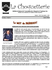 tous nos bénévoles. C'est au poète Robert Choquette que nous devons la création de l'expression « Choquetterie », qui fut le titre d'un poème qu'il écrivit à l'intention du curé Élisée Choquet, pour s'excuser de ne pouvoir assister aux Fêtes du Tricentenaire en 1965. Élisée parla ensuite pendant longtemps de « La Choquetterie ». Quoi de plus normal, donc, que de choisir ce nom pour le bulletin de notre Association, ce que le C.A. s'est bien sûr empressé de faire.