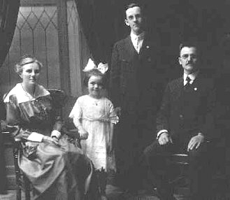 Some members of Henri Choquette and Mathilde Letarte's Family in front of their house in St-Grégoire, P.Q. (1898) : Hector, Phéodorine, Alexandrine, and the parents