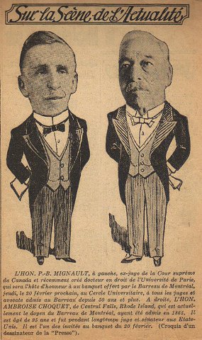 L'HON. P.-B. MIGNAULT, à gauche, ex-juge de la Cour Suprême du Canada et récemment créé docteur en droit de l'Université de Paris, qui sera l'hôte d'honneur à un banquet offert par le Barreau de Montréal, jeudi, le 20 février prochain, au Cercle Universitaire, à tous les juges et avocats admis au Barreau depuis 30 ans et plus. À droite, L'HON. AMBROISE CHOQUET, de Central Falls, Rhode Island, qui est actuellement le doyen du Barreau de Montréal, ayant été admis en 1865. Il est âgé de 95 ans et fut pendant longtemps juge et sénateur aux États-Unis. Il est l'un des invités ay banquet du 20 février. (Croquis d'un dessinateur de la "Presse". (Circa 1935) |