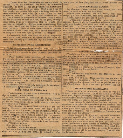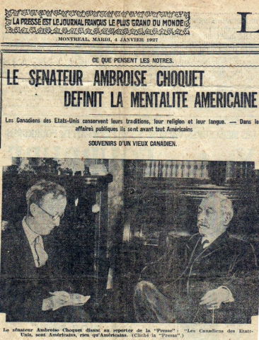 Les Canadiens des États-Unis conservent leurs traditions, leur religion et leur langue Dans les affaires publiques ils sont avant tout Américains. SOUVENIRS D'UN VIEUX CANADIEN La Presse, mardi 4 janvier 1927 Légende de la photo : Le sénateur Ambroise