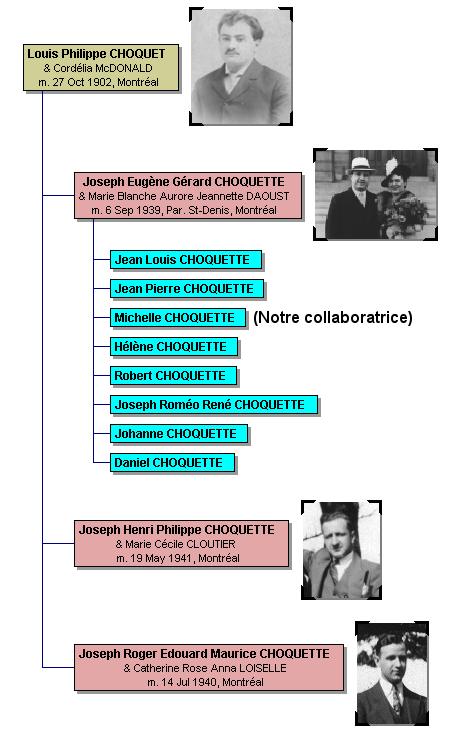Voici une version abrégée de l'arbre généalogique de notre collaboratrice Michelle Choquette. En cliquant sur les photos, vous obtiendrez un agrandissement. (utilisez la touche « retour » ou « back » de votre navigateur pour revenir ici). |
