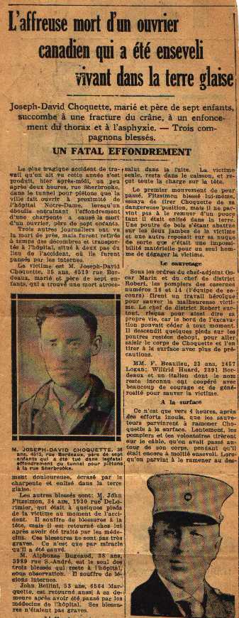 La victime est M. Joseph-David Choquette, 35 ans, 4519 rue Bordeaux, marié et père de sept enfants, qui a trouvé une mort atrocement douloureuse, écrasé par la charpente et enlisé dans la terre glaise.
